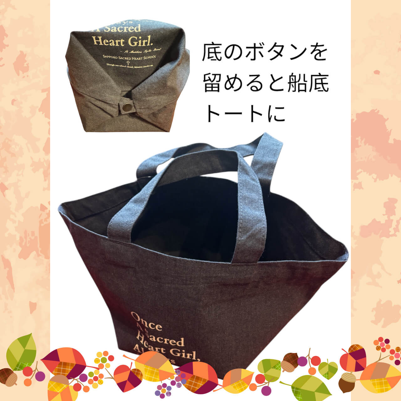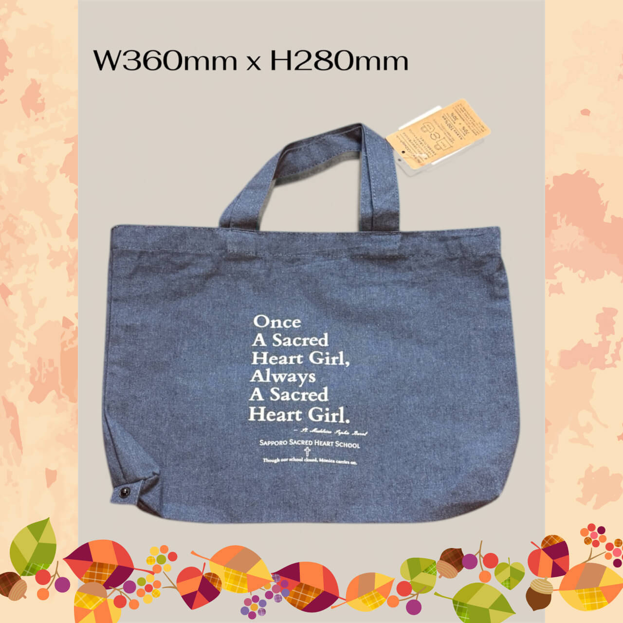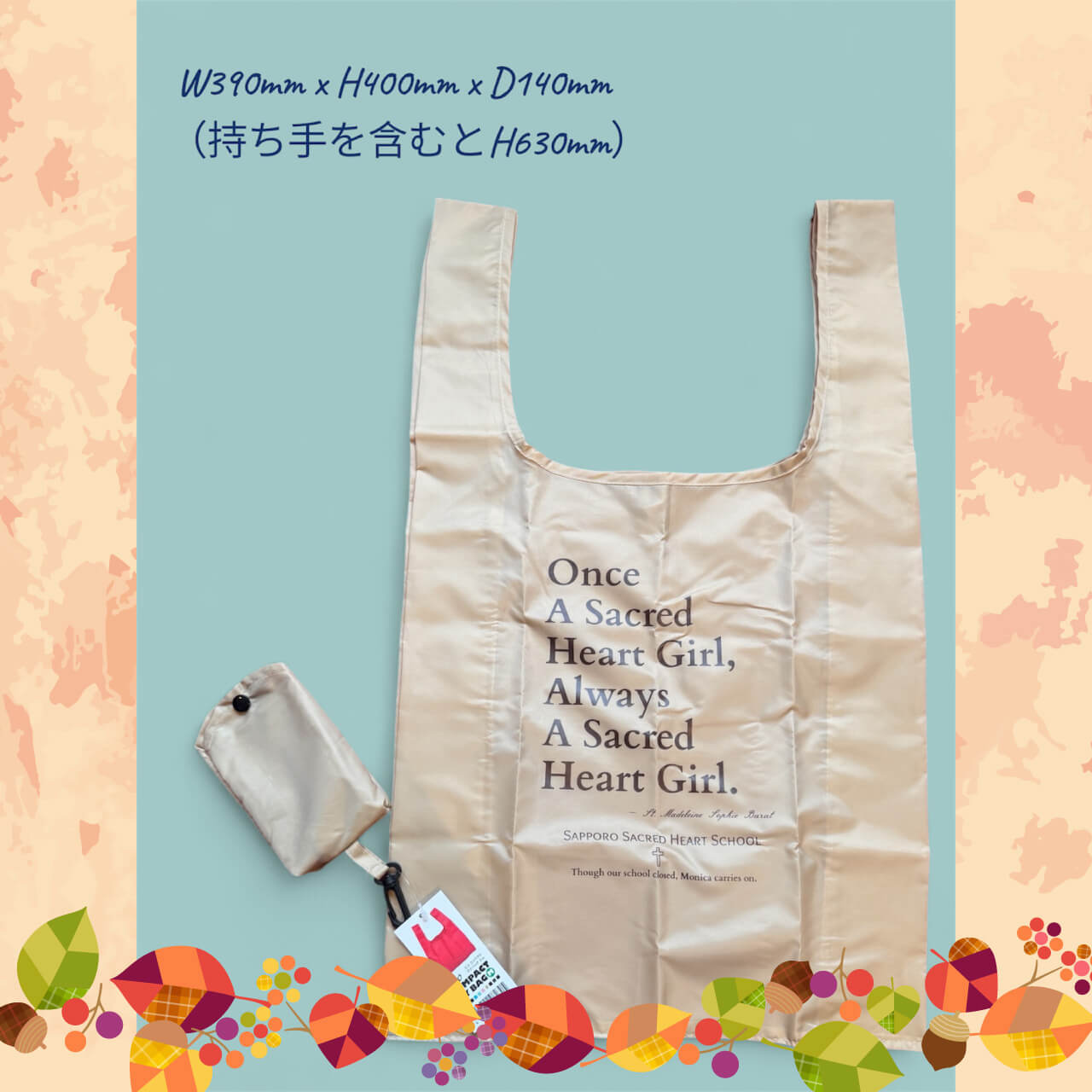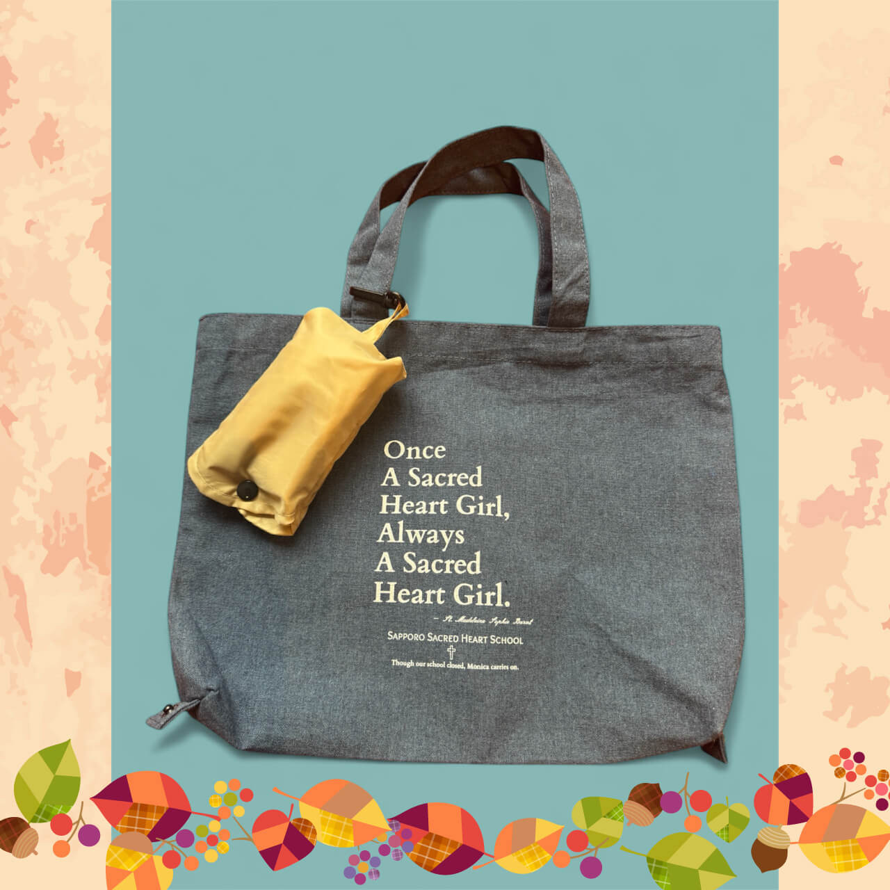 聖マグダレナ・ソフィアのお言葉「Once a Sacred Heart Girl, Always a Sacred Heart Girl」を大きく配置し、校名とともに「Though our school closed,Monica carries on.(私たちの学校はなくなってしまったけれど、茂仁香会は続いていきます)」という一文を添えました。校章は権利の関係で使用できませんでしたが、エコバッグはダスターコートをほうふつとさせる色合いで、懐かしくお手に取っていただけること請け合いです!